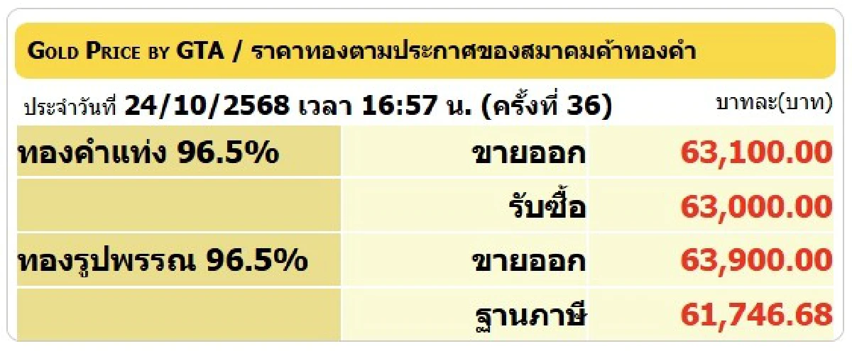 ราคาทองคำแท่ง (รับซื้อ) บาทละ 63,000 ทองคำแท่ง (ขายออก) บาทละ 63,100