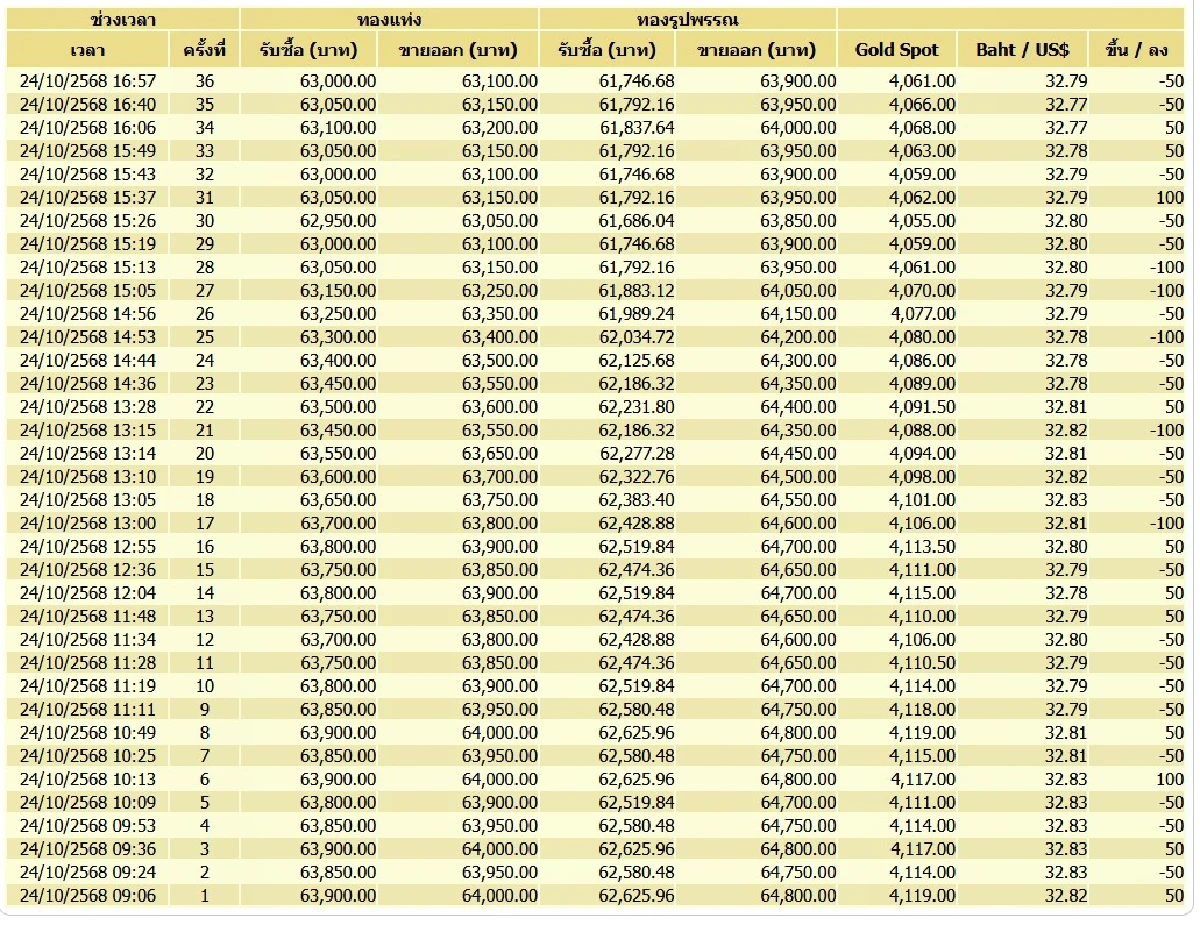 ที่มา : ราคาทองวันนี้ (24 ต.ค. 68) ปิดตลาด ราคาทองลง 850 บาท รูปพรรณขาย 63,900