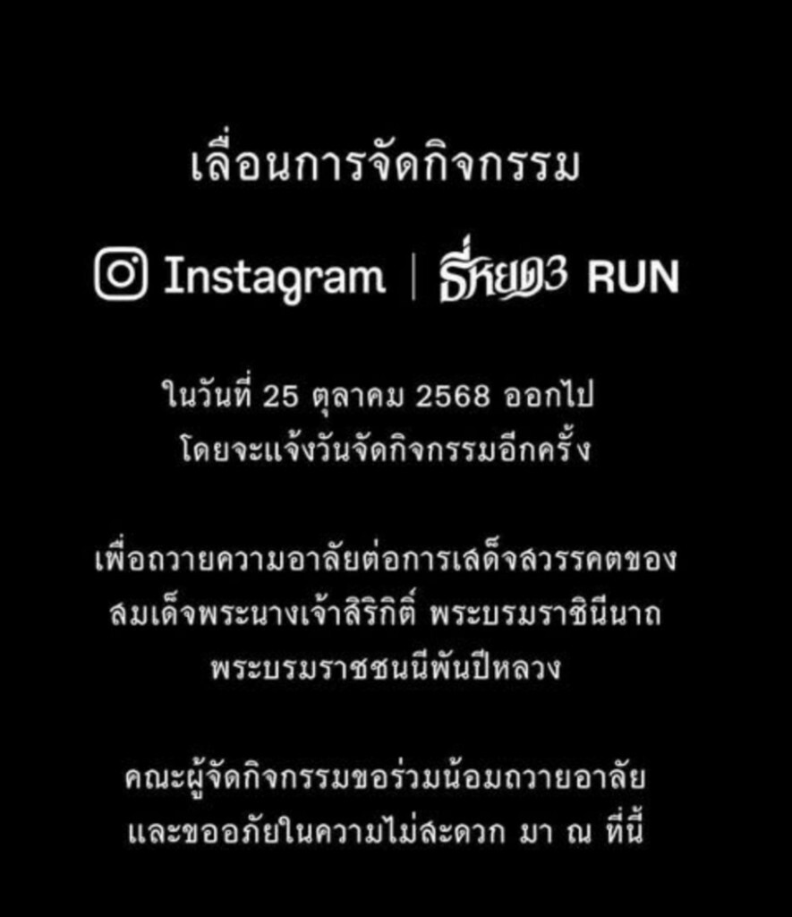 Instagram ธี่หยด3 Run ช่อง 3 แจ้งว่า คณะผู้จัดงานขอเลื่อนการจัดกิจกรรม ‘Instagram ธี่หยด3 Run’ ซึ่งมีกำหนดจัดขึ้นในวันเสาร์ที่ 25 ตุลาคม 2568 ที่ประปาแม้นศรี (หลังเก่า) ตั้งแต่เวลา 18.30 – 24.00 น. ออกไปก่อน โดยจะแจ้งวันจัดกิจกรรมใหม่ให้ทราบอีกครั้ง