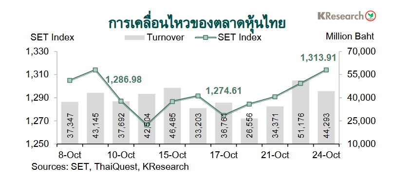 ตลาดหุ้นไทยยังมีแรงหนุนต่อเนื่อง โดยกลับมายืนเหนือแนว 1,300 จุดได้อีกครั้งช่วงกลางสัปดาห์ท่ามกลางแรงซื้อของกลุ่มนักลงทุนต่างชาติและบัญชีบริษัทหลักทรัพย์ นำโดย หุ้นกลุ่มแบงก์ที่รายงานผลประกอบการไตรมาส 3/2568 ออกมาดีกว่าคาด กลุ่มเทคโนโลยีจากการคาดการณ์เรื่องผลประกอบการไตรมาส 3/2568 รวมถึงหุ้นกลุ่มพลังงานจากอานิสงส์ของราคาน้ำมันในตลาดโลกปรับตัวขึ้น นอกจากนี้รายงานข่าวเกี่ยวกับการเปิดการเจรจาการค้ารอบใหม่ระหว่างสหรัฐฯ และจีน ช่วยหนุนให้ดัชนีหุ้นไทยขึ้นไปแตะจุดสูงสุดในรอบเกือบ 9 เดือนที่ระดับ 1,319.76 จุดในช่วงท้ายสัปดาห์ด้วยเช่นกัน