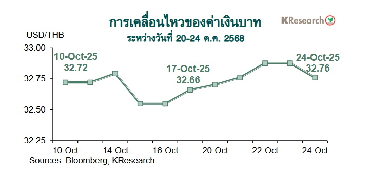 ในวันศุกร์ที่ 24 ต.ค. 2568 เงินบาทปิดตลาดในประเทศที่ 32.76 บาทต่อดอลลาร์ฯ เทียบกับระดับ 32.66 บาทต่อดอลลาร์ฯ ในวันศุกร์ก่อนหน้า (17 ต.ค.) สำหรับสถานะพอร์ตการลงทุนของนักลงทุนต่างชาติระหว่างวันที่ 20-24 ต.ค. 2568 นั้น นักลงทุนต่างชาติซื้อสุทธิหุ้นไทย 7,777 ล้านบาท และมีสถานะอยู่ในฝั่ง Net Inflows เข้าตลาดพันธบัตรไทย 6,584 ล้านบาท (ซื้อสุทธิพันธบัตร 10,589 ล้านบาท หักตราสารหนี้หมดอายุ 4,005 ล้านบาท)