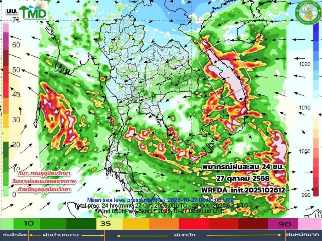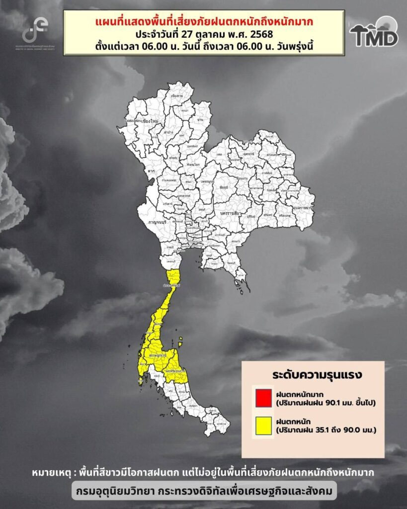 ในช่วงวันที่ 28 ต.ค. – 1 พ.ย. 2568 ขอให้ประชาชนบริเวณประเทศไทยตอนบน และภาคใต้ ระวังอันตรายจากฝนตกหนักถึงหนักมากและและฝนที่ตกสะสม ซึ่งอาจทำให้เกิดน้ำท่วมฉับพลันและน้ำป่าไหลหลาก โดยเฉพาะพื้นที่ลาดเชิงเขาใกล้ทางน้ำไหลผ่านและพื้นที่ลุ่มไว้ด้วย