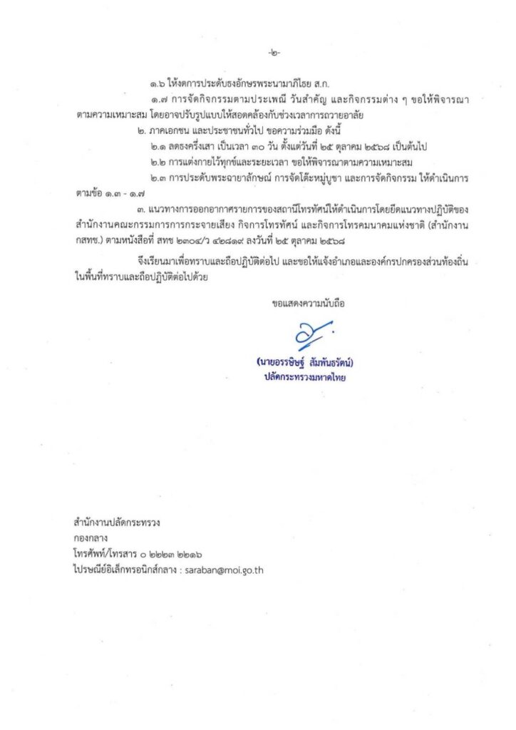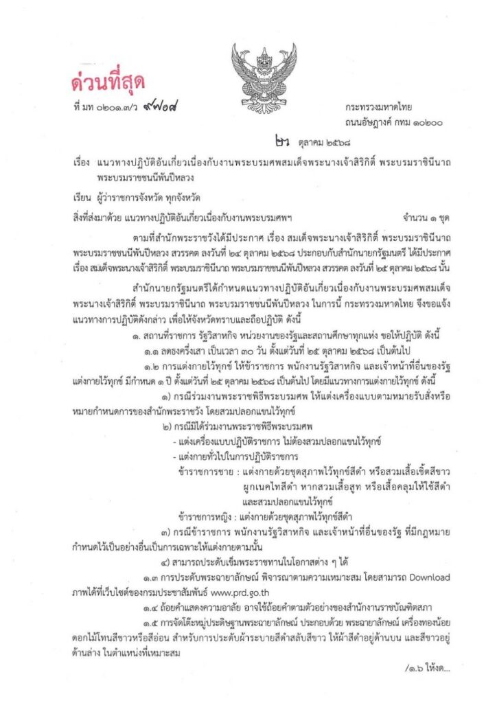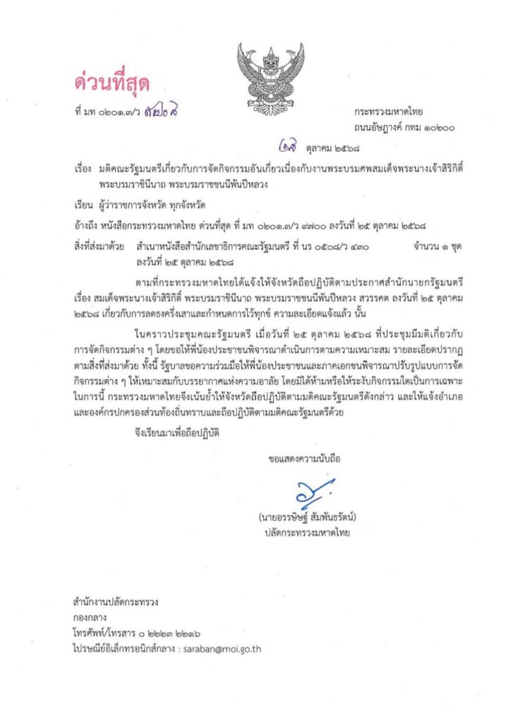 นายอรรษิษฐ์ สัมพันธรัตน์ ปลัดกระทรวงมหาดไทย มีหนังสือถึงผู้ว่าราชการจังหวัดทั่วประเทศ เกี่ยวกับการจัดกิจกรรมอันเนื่องกับงานพระบรมศพ สมเด็จพระนางเจ้าสิริกิติ์ พระบรมราชินีนาถ พระบรมราชชนนีพันปีหลวง ตามมติคณะรัฐมนตรีเมื่อวันที่ 25 ตุลาคม 2568