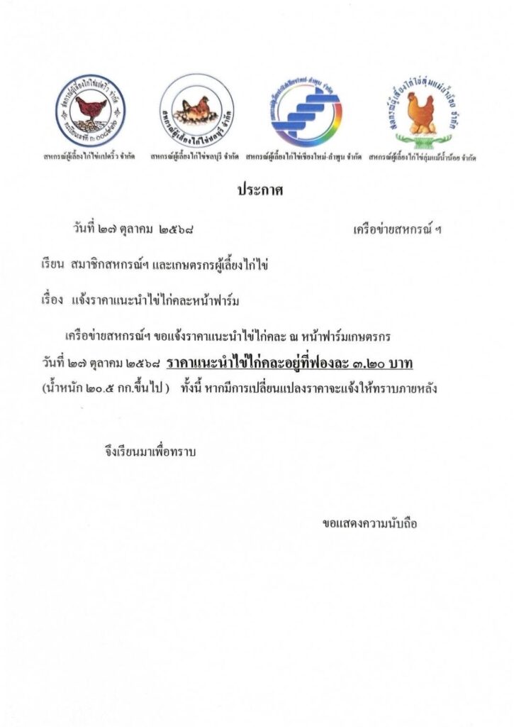 เมื่อวันที่ 27 ตุลาคม เครือข่ายสหกรณ์ผู้เลี้ยงไก่ไข่ ซึ่งประกอบด้วย สหกรณ์ผู้เลี้ยงไก่ไข่แปดริ้ว จำกัด สหกรณ์ผู้เลี้ยงไก่ไข่ชลบุรี จำกัด สหกรณ์ผู้เลี้ยงไก่ไข่เชียงใหม่-ลำพูน จำกัด และสหกรณ์ผู้เลี้ยงไก่ไข่กลุ่มแม่น้ำน้อย จำกัด แจ้งว่า ได้มีการปรับราคาไข่ไก่คละหน้าฟาร์มเกษตรกรลง 20 สตางค์/ฟอง หรือประมาณ แผงละ 6 บาท จาก 3.40 บาท/ฟอง เป็น 3.20 บาท/ฟอง โดยมีผลตั้งแต่วันนี้เป็นต้นไป (27 ต.ค.) จนกว่าจะมีการเปลี่ยนแผลง