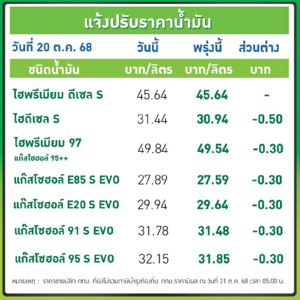 ที่มา : ราคาน้ำมันพรุ่งนี้2568 (29 ต.ค. 68) บางจาก ปตท. อัปเดตราคาล่าสุด