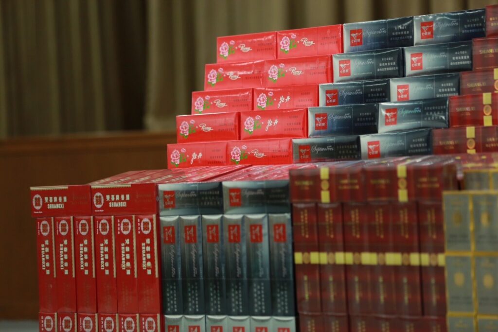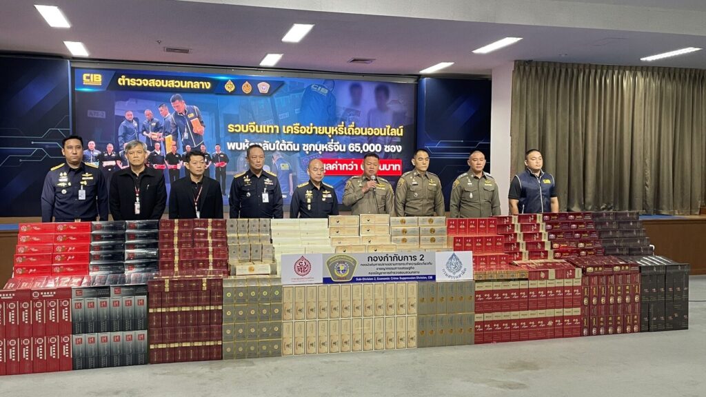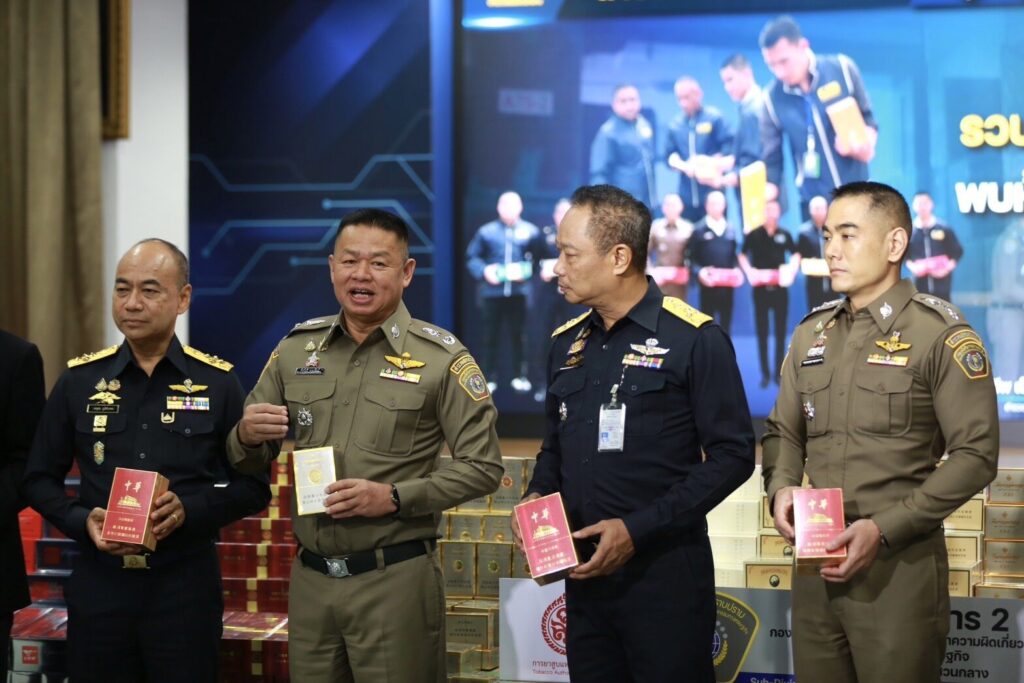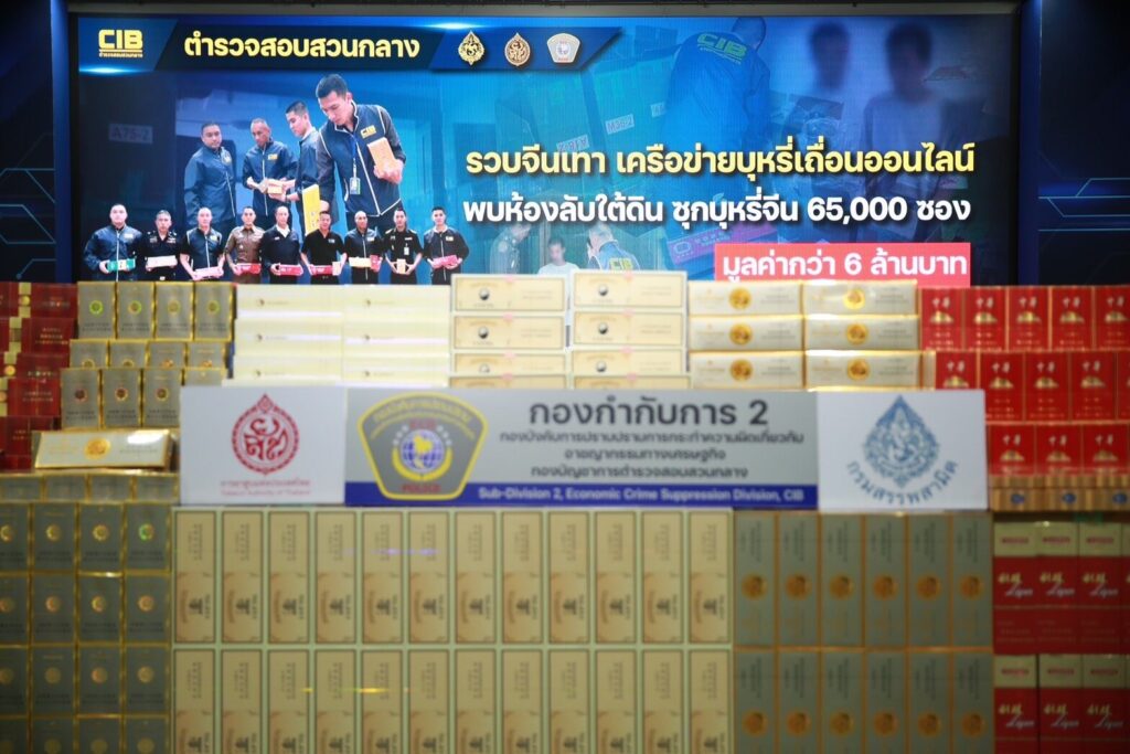 ร่วมกันแถลงผลปฏิบัติ รวบจีนเทา เครือข่ายจำหน่ายบุหรี่เถื่อนออนไลน์รายใหญ่ ตรวจพบห้องลับใต้ดินย่านรัชดาภิเษก เก็บบุหรี่จีนเถื่อน 65,000 ซอง มูลค่ากว่า 6 ล้านบาท โดยสามารถจับกุม นายฟาง เหว่ยซิน (MT.FANG WEIXIN) อายุ 34 ปี สัญชาติจีน พร้อมของกลาง-บุหรี่ ที่มีแหล่งกำเนิดมาจากต่างประเทศจีน ที่มิได้เสียภาษีหรือเสียภาษีไม่ครบถ้วน จำนวน 65,000 ซอง จากการตรวจค้น 2 จุดได้เเก่ จุดที่ 1 ซอยรัชดาภิเษก 10 แขวงห้วยขวาง เขตห้วยขวาง กรุงเทพมหานคร จุดที่ 2 ซอยลาดพร้าว 23 แขวงจันทรเกษม เขตจตุจักร กรุงเทพมหานคร
