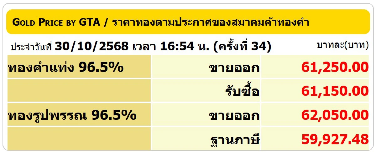 ที่มา : ราคาทองคำวันนี้ (30 ต.ค.68) ผันผวนหนัก ทองรูปพรรณ ขายออก 62,050