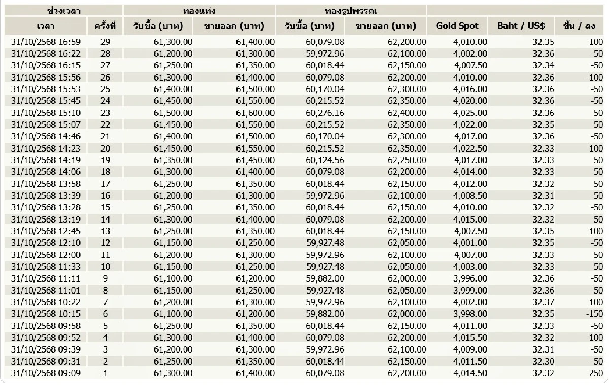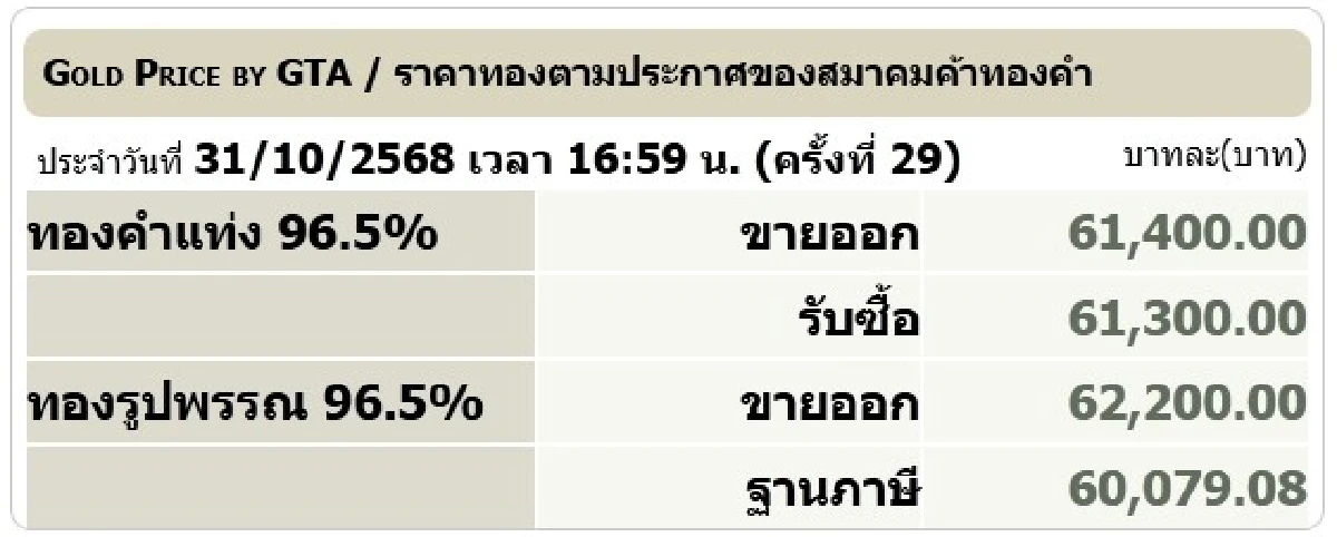 ราคาทองวันนี้ (31 ต.ค. 68) ปิดตลาด ราคาทองขึ้น 250 บาท ทองรูปพรรณขาย 62,200