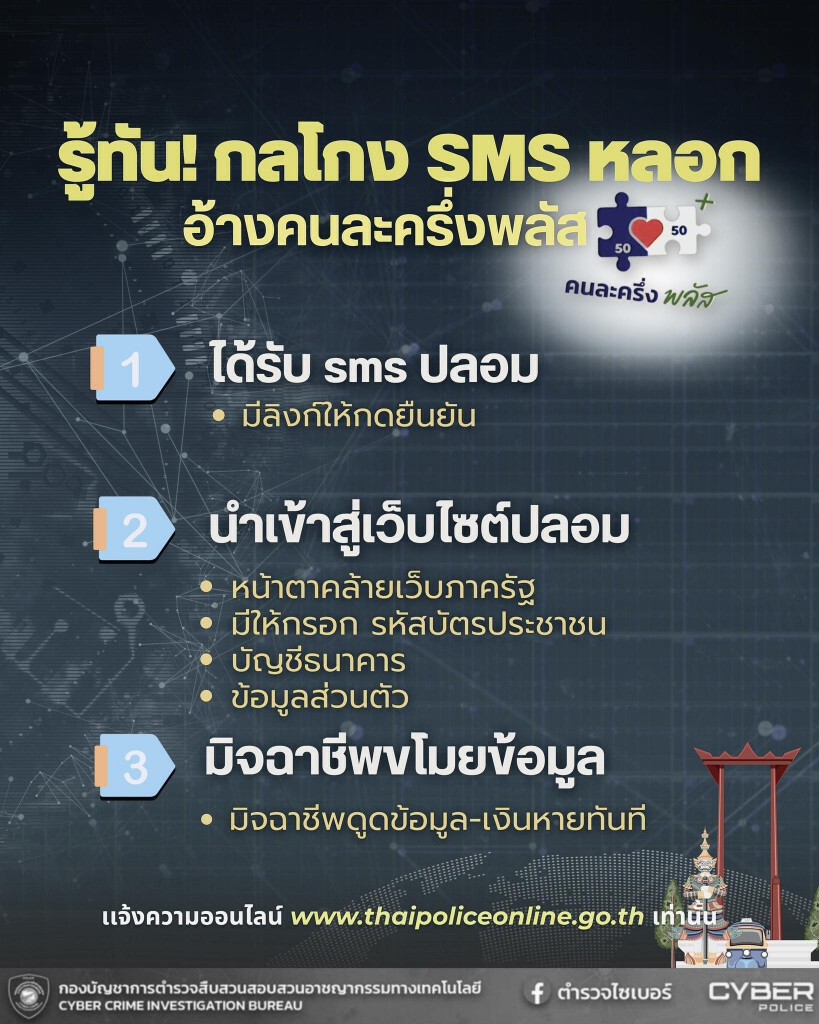 - มิจฉาชีพส่ง SMS ปลอมแอบอ้างโครงการ "คนละครึ่งพลัส" โดยแนบลิงก์หลอกให้กรอกข้อมูลส่วนตัวเพื่อขโมยเงิน