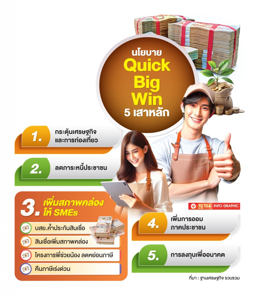 มาตรการ Quick Big Win ในการเพิ่มสภาพคล่องให้ผู้ประกอบการเอสเอ็มอี ได้แก่ การค้ำประกันสินเชื่อ โดยใช้บรรษัทประกันสินเชื่ออุตสาหกรรมขนาดย่อม (บสย.) เข้ามาค้ำประกันสินเชื่อในวงเงินขั้นต่ำ 50,000 ล้านบาท, ให้ธนาคารช่วยสนับสนุน SME ผ่านโครงการสินเชื่อสนับสนุนสภาพคล่อง, โครงการพี่ช่วยน้อง ที่เป็นการให้สิทธิประโยชน์ทางภาษีแก่บริษัทขนาดใหญ่ที่ช่วยเหลือผู้ประกอบการรายย่อยในห่วงโซ่อุปทานและการคืนภาษีเร่งด่วน โดยให้กรมสรรพากรเร่งคืนภาษีมูลค่าเพิ่มให้แก่ผู้ประกอบการ เพื่อเพิ่มสภาพคล่องให้ธุรกิจ
