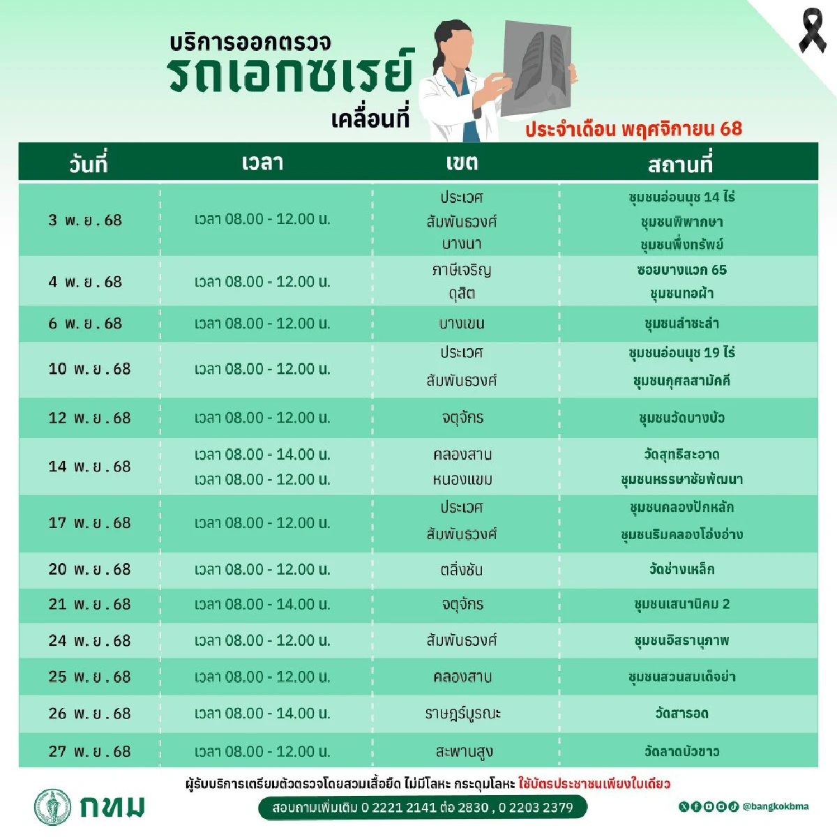 กรุงเทพมหานคร (กทม.) เปิดพิกัด บริการตรวจเอกซเรย์ปอดเคลื่อนที่ ประจำเดือนพฤศจิกายน 2568 ใช้บัตรประชาชนเพียงใบเดียว
