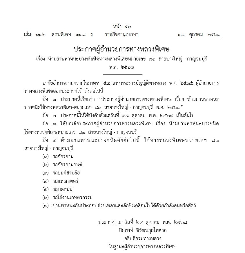 วันที่ 3 พ.ย.2568 ผู้สื่อข่าวรายงานว่า เว็บไซต์ ราชกิจจานุเบกษา เผยแพร่ประกาศผู้อำนวยการทางหลวงพิเศษ เรื่อง ห้ามยานพาหนะบางชนิดใช้ทางหลวงพิเศษหมายเลข 81 (มอเตอร์เวย์ M81) สายบางใหญ่-กาญจนบุรี พ.ศ. 2568 ระบุว่า