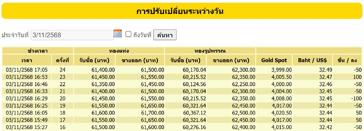 ที่มา : ราคาทองคำวันนี้ (3 พ.ย.68) ทั้งวันปรับ 24 ครั้ง ปิดตลาด บวก 100 บาท
