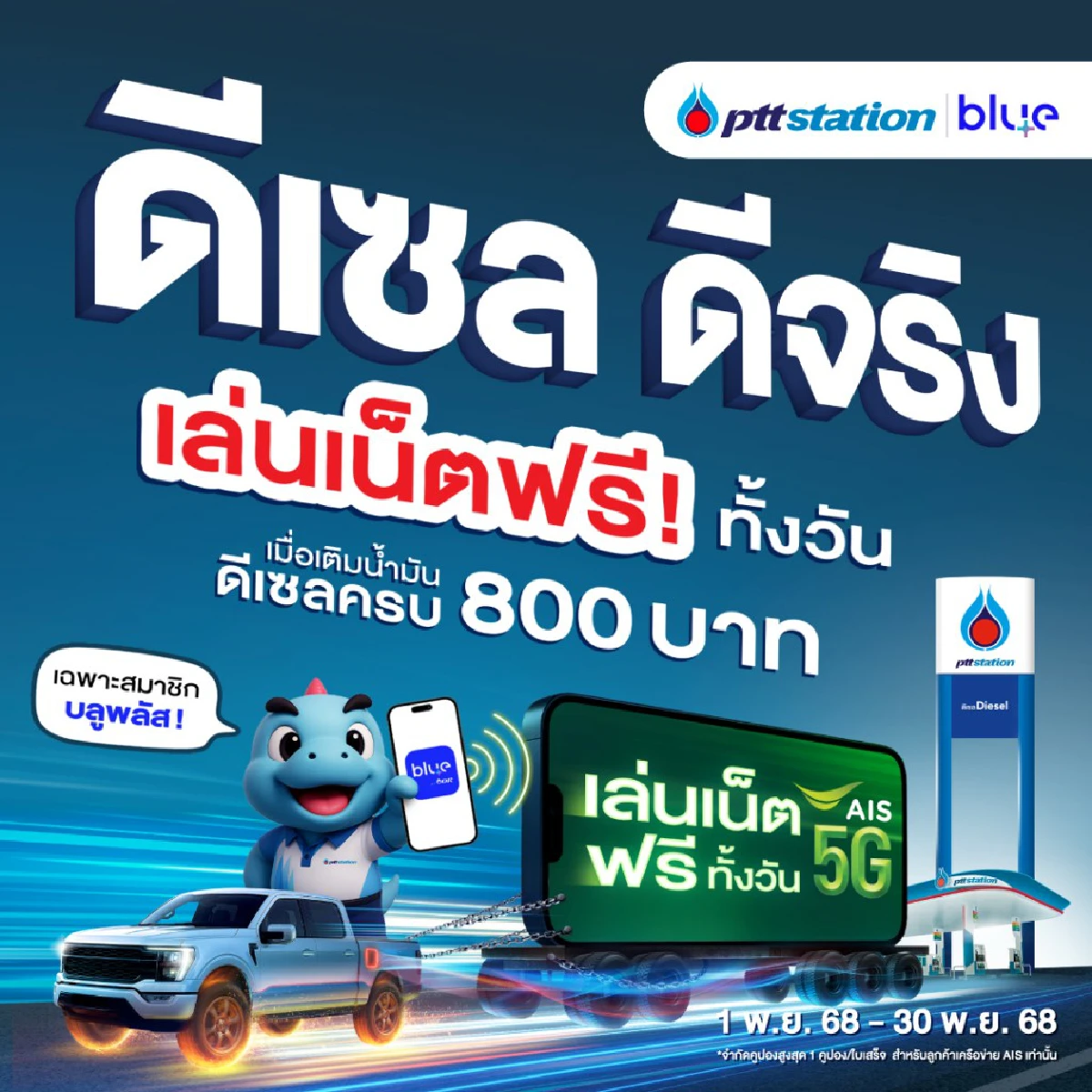 ใครหาเน็ตฟรีอยู่ มาทางนี้ มีโปรแล้ว ใครได้บ้าง? เติมน้ำมันวันนี้ ในปั๊มดัง "ปตท." พีทีที สเตชั่น ทั่วประเทศ ได้เล่นเน็ตฟรีทั้งวัน 5G เร็วคุ้มจริง เช็กเงื่อนไข สมาชิก ไม่จำกัดการลงทะเบียนรับสิทธิ์ แจกคูปอง ยาวไปถึงสิ้นเดือนพฤศจิกายน 2568