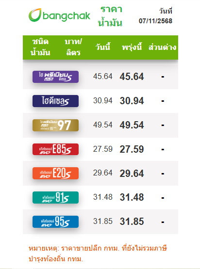 หมายเหตุ : ราคาอ้างอิงจาก บมจ.บางจากฯ ควรตรวจสอบราคา ณ สถานีเติมน้ำมันอีกครั้ง ราคาข้างต้นยังไม่รวมภาษีบำรุงท้องที่ กทม. ราคาพรุ่งนี้จะมีผลตั้งแต่เวลา 05.00 น.