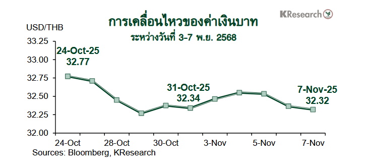 ในวันศุกร์ที่ 7 พ.ย. 2568 เงินบาทปิดตลาดในประเทศที่ 32.32 บาทต่อดอลลาร์ฯ เทียบกับระดับ 32.34 บาทต่อดอลลาร์ฯ ในวันศุกร์ก่อนหน้า (31 ต.ค.) สำหรับสถานะพอร์ตการลงทุนของนักลงทุนต่างชาติระหว่างวันที่ 3-7 พ.ย. 2568 นั้น แม้นักลงทุนต่างชาติขายสุทธิหุ้นไทย 1,265 ล้านบาท แต่มีสถานะอยู่ในฝั่ง Net Inflows เข้าตลาดพันธบัตรไทยถึง 8,227 ล้านบาท (ซื้อสุทธิพันธบัตร 8,232 ล้านบาท หักตราสารหนี้หมดอายุ 5 ล้านบาท)