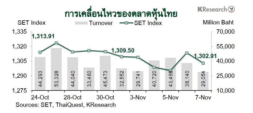 อย่างไรก็ดี ดัชนีหุ้นไทยดีดตัวขึ้นกลับมายืนเหนือ 1,300 จุดได้อีกครั้งในเวลาต่อมา นำโดย หุ้นกลุ่มสื่อสารจากผลประกอบการไตรมาส 3/2568 ที่ออกมาดีกว่าที่คาด ดัชนีหุ้นไทยกลับมาย่อตัวลงอีกครั้งช่วงท้ายสัปดาห์ตามทิศทางตลาดหุ้นภูมิภาค หลังตลาดกลับมากังวลประเด็นภาวะฟองสบู่ในหุ้นกลุ่มเทคโนโลยีของสหรัฐฯ อีกครั้ง ประกอบกับไร้ปัจจัยใหม่ ๆ เข้ามากระตุ้น ทำให้มีแรงขายทำกำไรหุ้นรายตัว นำโดย กลุ่มแบงก์และกลุ่มผู้ผลิตชิ้นส่วนอิเล็กทรอนิกส์