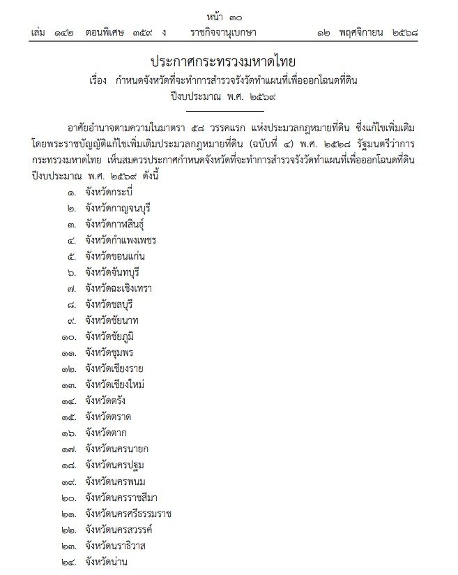 อาศัยอำนาจตามความในมาตรา 58 วรรคแรก แห่งประมวลกฎหมายที่ดิน ซึ่งแก้ไขเพิ่มเติมโดยพระราชบัญญัติแก้ไขเพิ่มเติมประมวลกฎหมายที่ดิน (ฉบับที่ 4) พ.ศ.2528 รัฐมนตรีว่าการกระทรวงมหาดไทย เห็นสมควรประกาศกำหนดจังหวัดที่จะทำการสำรวจรังวัดทำแผนที่เพื่ออออกโฉนดที่ดิน ปีงบประมาณ พ.ศ.2569 ดังนี้