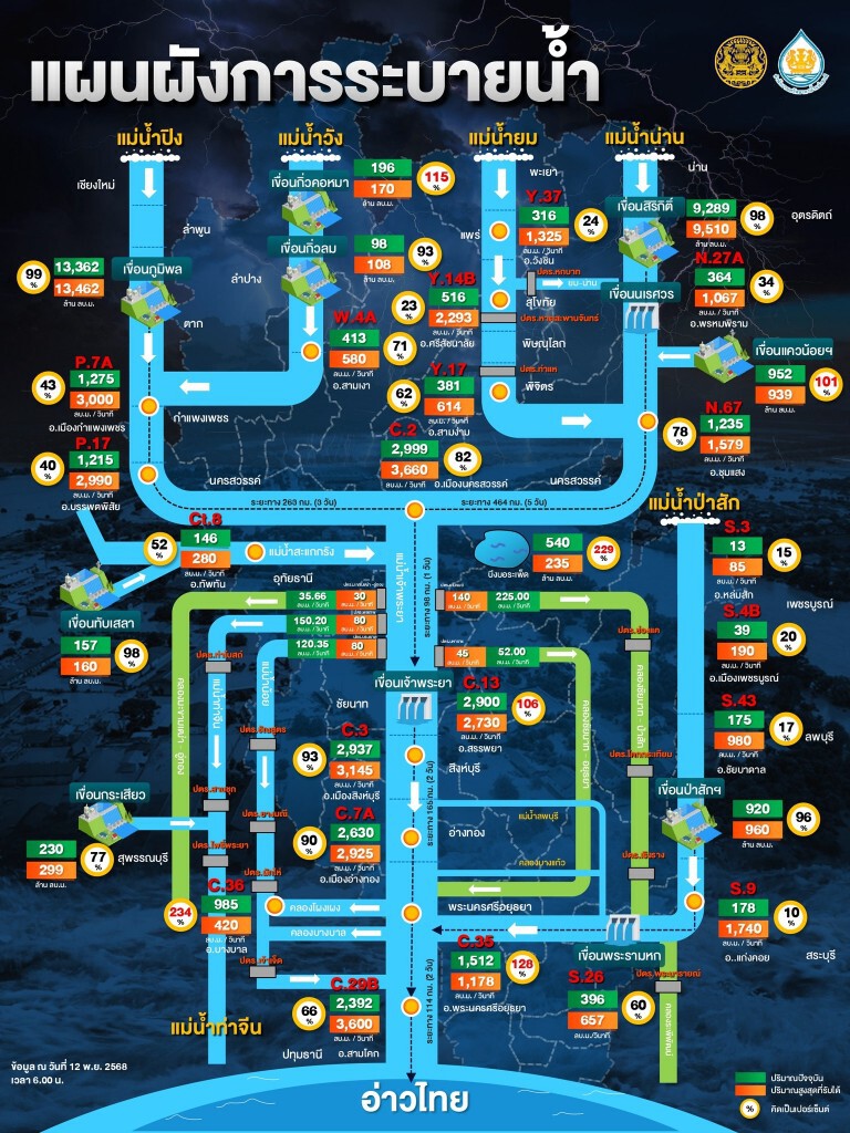 ปัจจุบันเขื่อนเจ้าพระยายังคงอัตราการระบายน้ำที่ 2,900 ลบ.ม.ต่อวินาที ซึ่งเป็นไปตามข้อสั่งการของนายอนุทิน ชาญวีรกูล นายกรัฐมนตรีและรัฐมนตรีว่าการกระทรวงมหาดไทย และนายภราดร ปริศนานันทกุล รัฐมนตรีประจำสำนักนายกรัฐมนตรี ที่ได้กำชับให้คงอัตราการระบายดังกล่าว เพื่อไม่ไปซ้ำเติมผลกระทบต่อพื้นที่ท้ายน้ำ