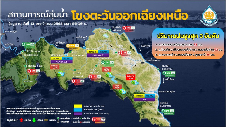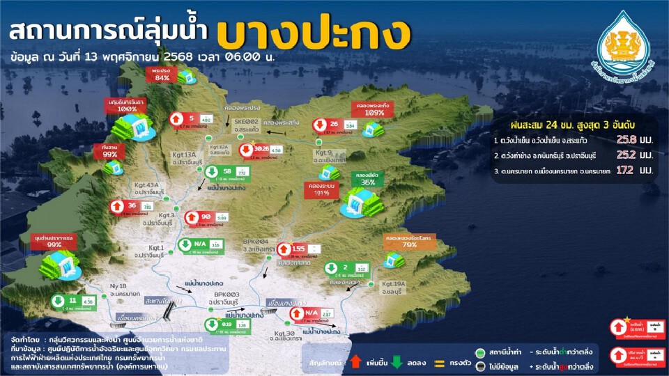 สถานการณ์น้ำรายลุ่มน้ำประจำวันที่ 13 พฤศจิกายน 2568