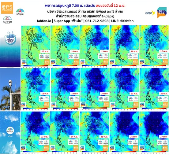 พยากรณ์อุณหภูมิต่ำสุดกรุงเทพฯ วันที่ 16-27 พ.ย. ดังนี้ 20.9, 22.7, 22.5, 20.5, 20.1, 20.8, 21.7, 20.5, 22.3, 21.8, 19.7, 18.4 องศาเซลเซียส