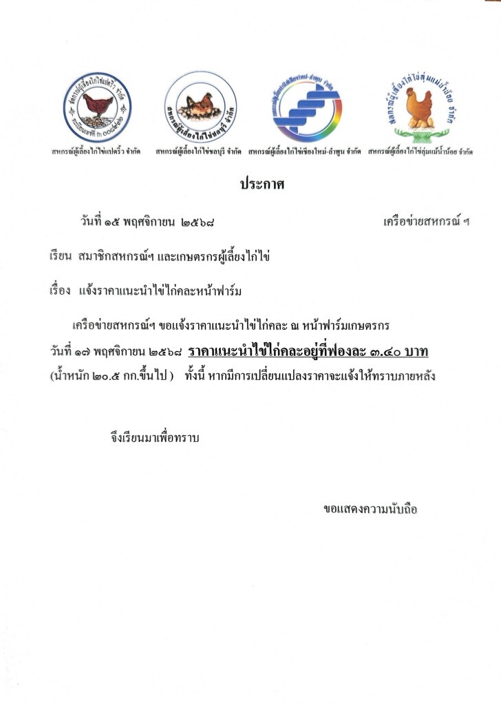วันที่ 17 พฤศจิกายน 2568 เครือข่ายสหกรณ์ผู้เลี้ยงไก่ไข่ ประกอบด้วย สหกรณ์ผู้เลี้ยงไก่ไข่แปดริ้ว จำกัด, สหกรณ์ผู้เลี้ยงไก่ไข่ชลบุรี จำกัด, สหกรณ์ผู้เลี้ยงไก่ไข่เชียงใหม่-ลำพูน จำกัด และสหกรณ์ผู้เลี้ยงไก่ไข่ลุ่มแม่น้ำน้อย จำกัด ราคาไข่คละหน้าฟาร์ม ปรับขึ้น 20 สตางค์ต่อฟอง หรือ ปรับราคาขึ้เนแผงละ 6 บาท จากราคา 3.20 บาทต่อฟอง เป็น 3.40 บาทต่อฟอง มีผลตั้งแต่วันนี้เป็นต้นไป