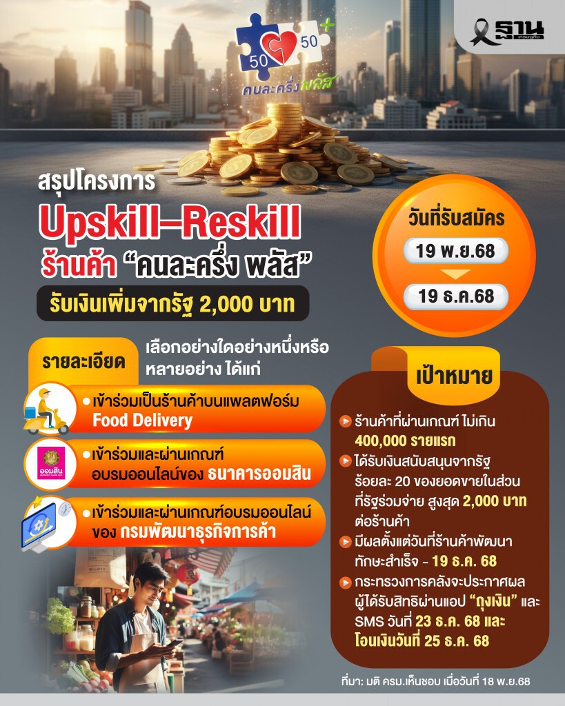 จากกรณีที่เมื่อวันอังคารที่ 18 พฤศจิกายน 2568 ที่ผ่านมา ครม.มีมติเห็นชอบโครงการพัฒนาความรู้ทักษะ (Upskill) หรือ เรียนรู้ทักษะใหม่ (Reskill) สำหรับร้านค้าที่เข้าร่วมโครงการคนละครึ่งพลัส
