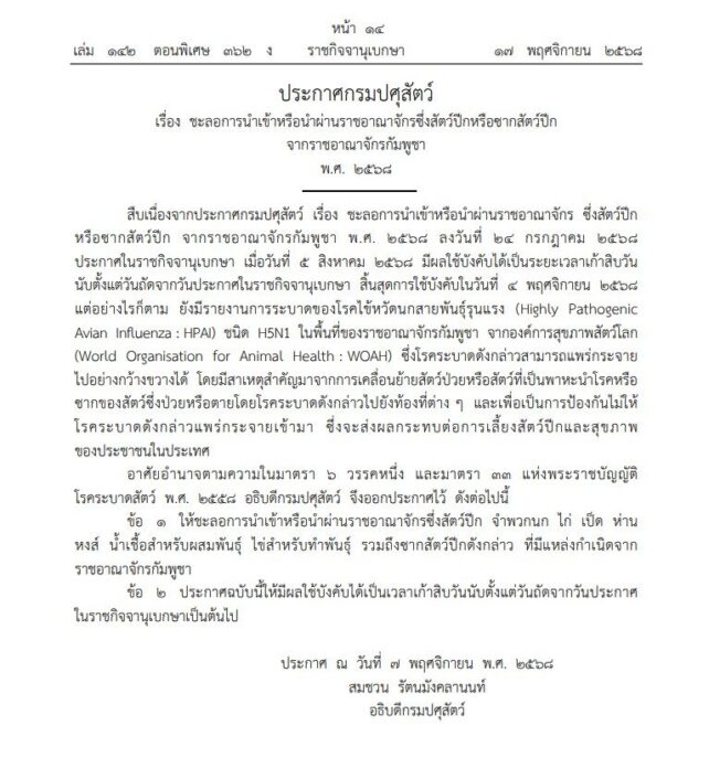 ราชกิจจานุเบกษา เผยแพร่ประกาศ ชะลอการนำเข้า และนำผ่านสัตว์ปีก–ซากสัตว์ปีก จากกัมพูชา หลังพบการระบาดของ โรคไข้หวัดนก สายพันธุ์รุนแรง มีผลใช้บังคับ 90 วัน