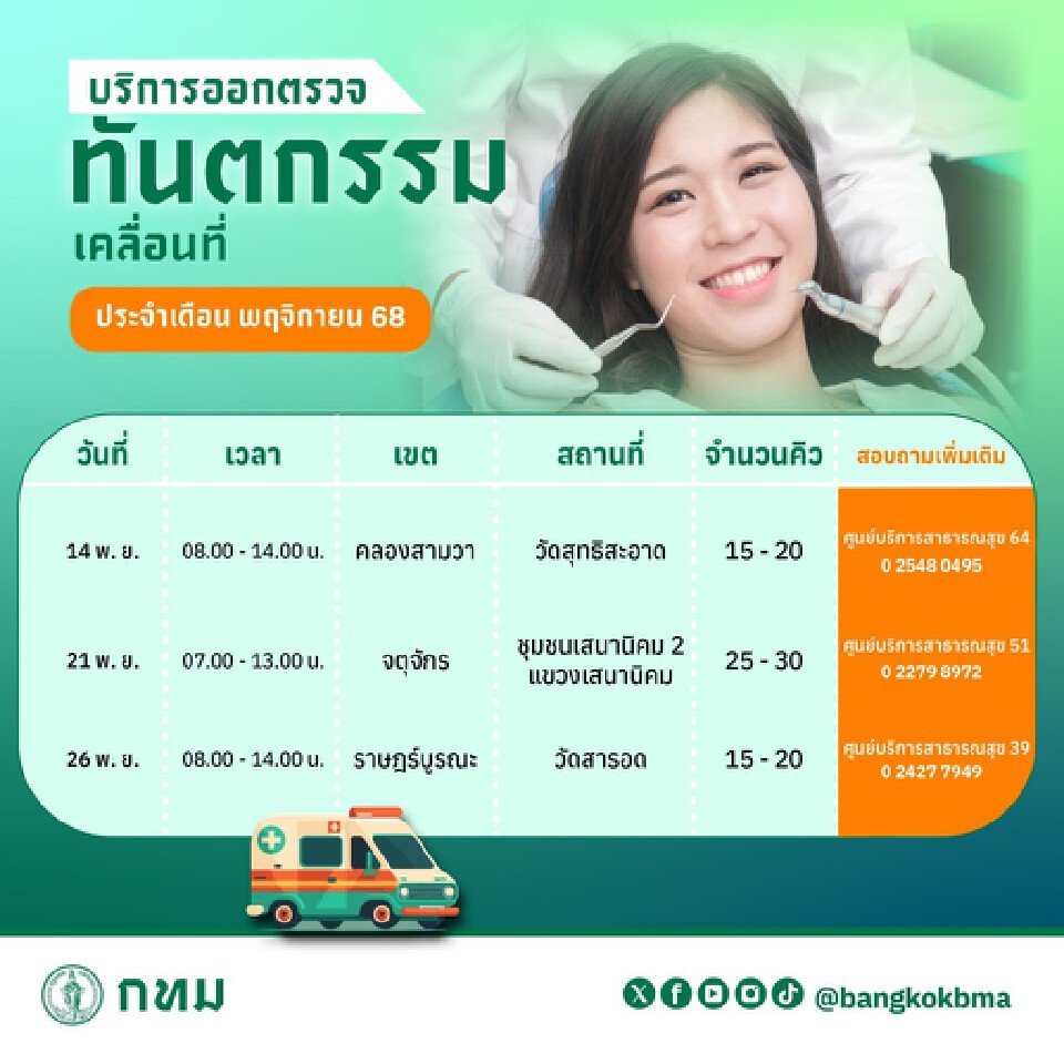 กทม.อัปเดตจุดให้บริการหน่วยแพทย์เคลื่อนที่ บริการตรวจสุขภาพฟรี บริการรถทันตกรรมเคลื่อนที่ รถคลายเครียด เดือนพฤศจิกายน 2568 เช็กรายละเอียด วัน เวลา พร้อมจุดให้บริการได้ที่นี่