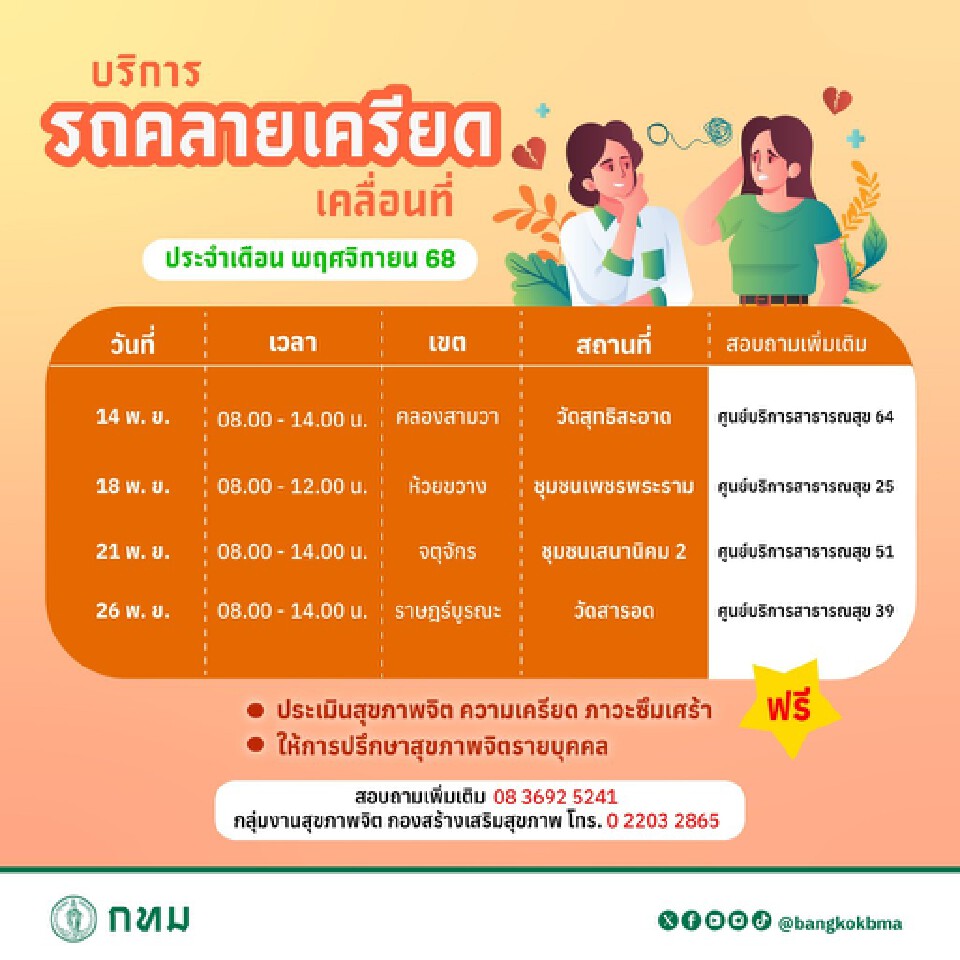 กรุงเทพมหานคร ห่วงใยใส่ใจสุขภาพบริการรถสุขภาพเชิงรุก ตรวจถึงชุมชน (Mobile Medical Unit) ให้บริการฟรีตลอดเดือนพฤศจิกายน 2568 อาทิ ตรวจสุขภาพ, คัดกรองมะเร็งสตรี, ทันตกรรมเคลื่อนที่, รถคลายเครียดเคลื่อนที่ ให้คำปรึกษาสุขภาพจิต พร้อมแจกแว่นสายตายาวซึ่งมีรายละเอียดดังนี้