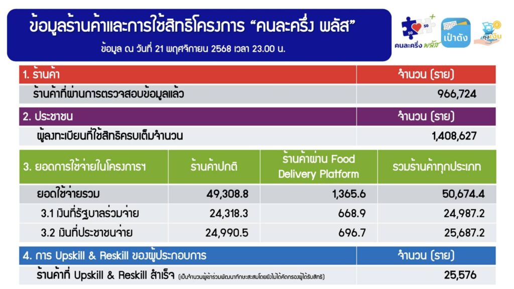 ผู้สื่อข่าวรายงานจากกระทรวงการคลัง เปิดเผยความคืบหน้าโครงการ “คนละครึ่ง พลัส” ว่า ข้อมูล ณ วันที่ 21 พฤศจิกายน 2568 เวลา 23.00 น. พบว่า มีร้านค้าที่ผ่านการตรวจสอบและเข้าร่วมโครงการแล้วจำนวน 966,724 ราย ทั่วประเทศ โดยมีประชาชนที่ใช้สิทธิครบเต็มจำนวน 1,408,627 ราย ขณะที่ยอดการใช้จ่ายสะสมภายใต้โครงการอยู่ที่ 50,674.4 ล้านบาท แบ่งเป็น