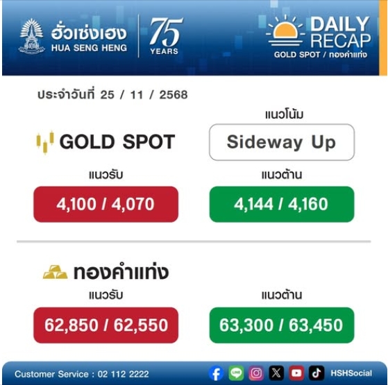 ราคาทองคำในประเทศเช้านี้ (25 พ.ย.) ปรับขึ้นแรง 800 บาทแล้ว “ฮั่วเซ่งเฮง” ชี้ปัจจัยจากดอลลาร์อ่อนค่า-บอนด์ยีลด์สหรัฐปรับลง มองแนวโน้มราคาวันนี้ “Sideway Up” แนวต้านที่ 4,144 ดอลลาร์ ทองคำแท่งแนวต้าน 63,300 บาท