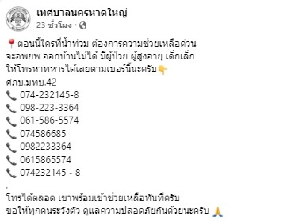 ที่มา : หาดใหญ่เปิดสายด่วนฉุกเฉิน 24 ชม. ช่วยอพยพผู้ประสบภัยน้ำท่วม | ไทยนิวส์