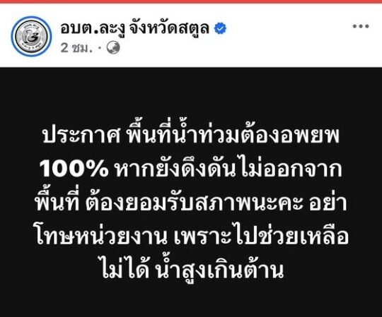 เมื่อวันที่ 26 พฤศจิกายน เฟซบุ๊ก อบต.ละงู จังหวัดสตูล ได้ออกประกาศว่า พื้นที่น้ำท่วมต้องอพยพ 100% หากยังดึงดันไม่ออกจากพื้นที่ ต้องยอมรับสภาพนะคะ อย่าโทษหน่วยงาน เพราะไปช่วยเหลือไม่ได้ น้ำสูงเกินต้าน