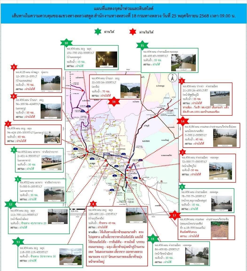 ขณะที่ผู้สื่อข่าวรายงานว่า ฝนที่ตกต่อเนื่องตั้งแต่วันที่ 20 พฤศจิกายน ทำให้สถานการณ์น้ำท่วมในจังหวัดสตูลเข้าสู่ภาวะวิกฤต หลายพื้นที่ราบลุ่ม พื้นที่ริมน้ำ พื้นที่เกษตรกรรม รวมถึงย่านเศรษฐกิจและท่องเที่ยวในอำเภอละงู ยังคงได้รับผลกระทบอย่างหนัก โดยเฉพาะเมื่อคืนที่ผ่านมา มีคำสั่งอพยพชาวบ้านในเขตเทศบาลตำบลละงูทั้งหมดไปยังศูนย์พักพิง เนื่องจากมวลน้ำจากพื้นที่ตอนบนกำลังไหลทะลักลงมาอย่างรวดเร็ว