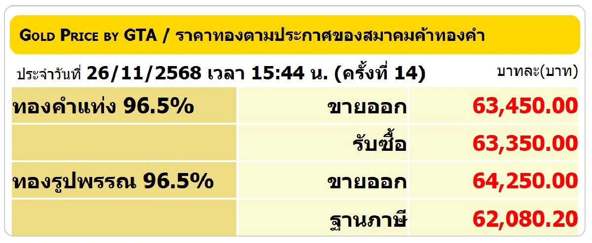 ที่มา : ราคาทองคำวันนี้ (26 พ.ย.68) ปรับ 14 ครั้ง ล่าสุด ปิดตลาด บวก 250 บาท