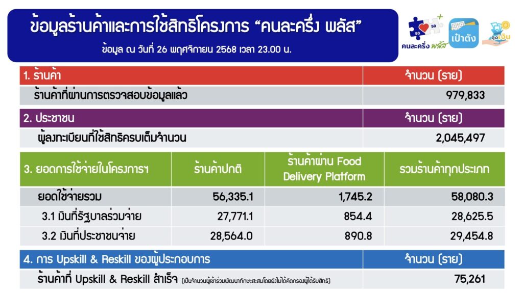 คนละครึ่งพลัส สะพัด 5.8 หมื่นล้าน ใช้เต็มวงเงิน 2 ล้านคน เหลือ 35 วัน คำนวณการใช้ให้ดี ก่อนถูกริบเงินคืน