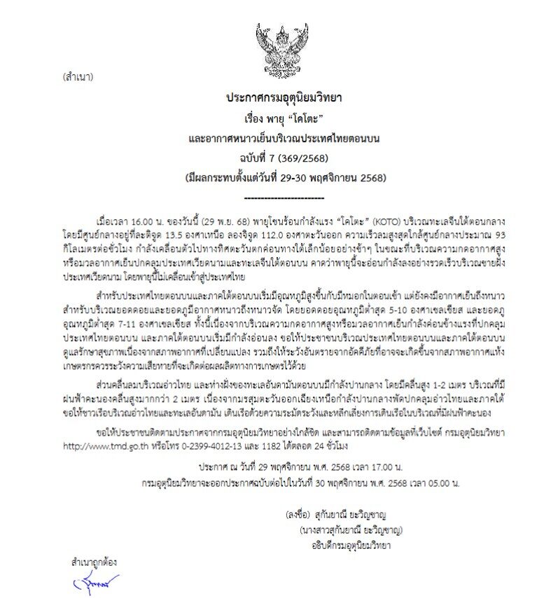 เวลา 17.00 น. กรมอุตุนิยมวิทยา ประกาศกรมอุตุนิยมวิทยา เรื่อง พายุ “โคโตะ” และอากาศหนาวเย็นบริเวณประเทศไทยตอนบน ฉบับที่ 7 (369/2568) (มีผลกระทบตั้งแต่วันที่ 29–30 พฤศจิกายน 2568) ความว่า