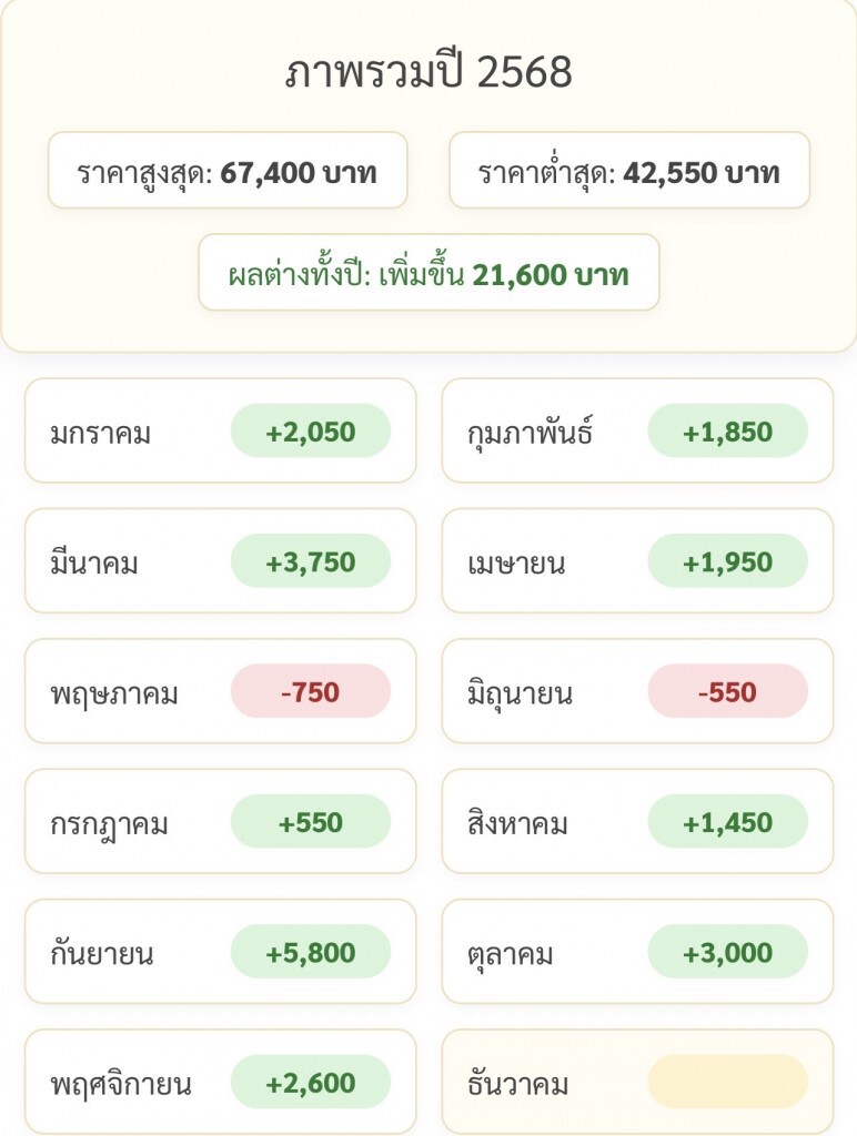 ราคาทองตั้งแต่วันที่ 1 ม.ค.-29 พ.ย. 68 มีการปรับราคาเพิ่มขึ้นแล้วถึง 21,600 บาท