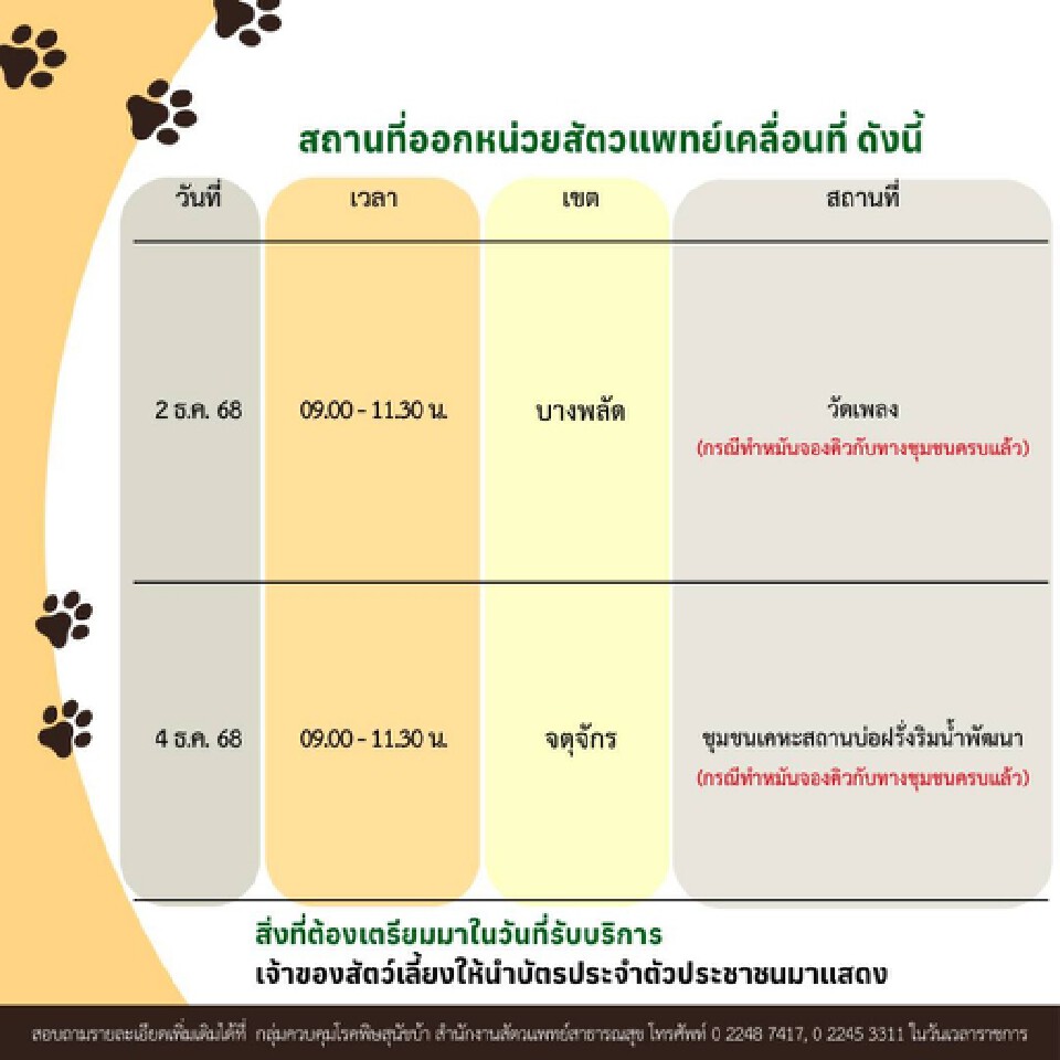 ในวันที่ 3 ธันวาคม 12568 ตั้งแต่เวลา 08.00-12.00 น. ณ ริมคลองสามเสน โดยศูนย์บริการสาธารณสุข 2 โทร. 02251-7735-7