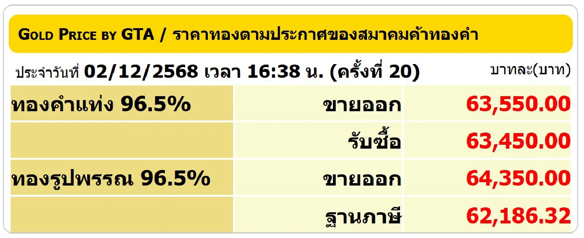 - ราคาทองรูปพรรณ รับซื้อบาทละ 62,186.32 บาท ขายออกบาทละ 64,350.00 บาท