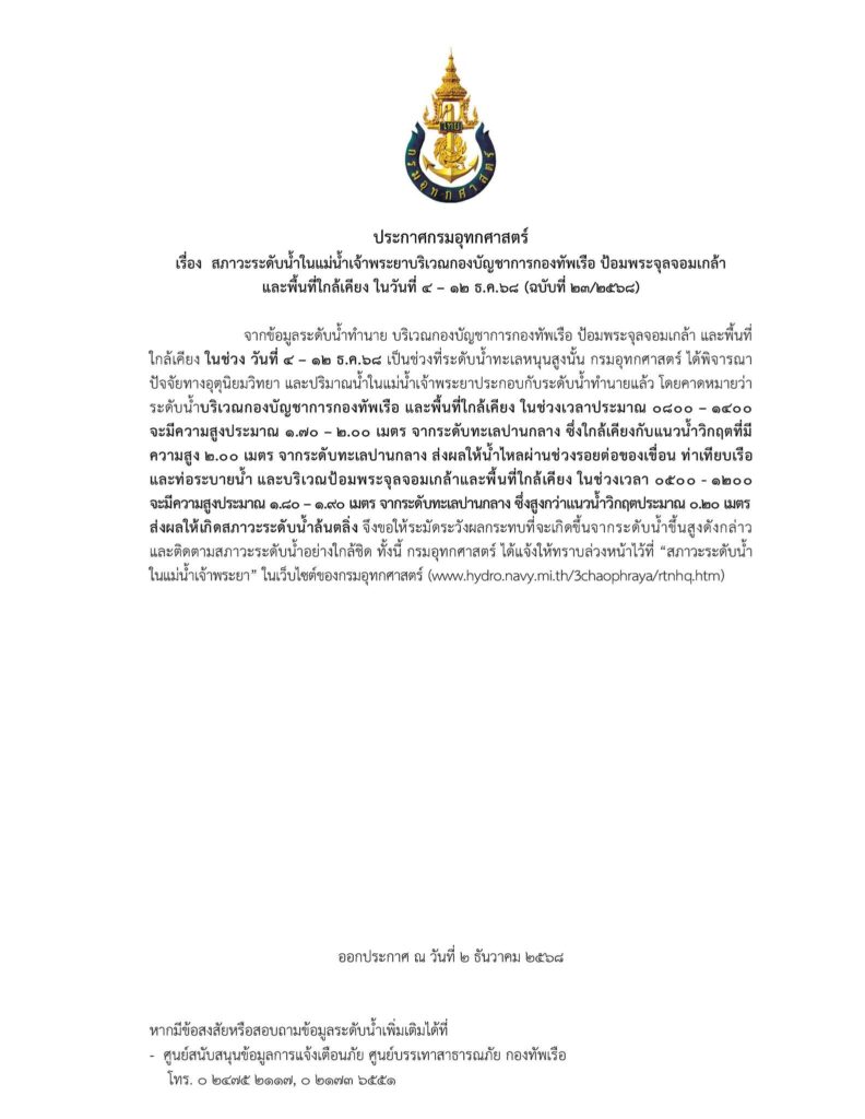 เมื่อวันที่ 3 ธันวาคม สำนักการระบายน้ำ กรุงเทพมหานคร แจ้งการระวังระดับน้ำในแม่น้ำเจ้าพระยาระหว่าง 4-12 ธันวาคมนี้ โดยอ้างอิง ประกาศกรมอุทกศาสตร์ กองทัพเรือ เรื่อง สภาวะระดับน้ำในแม่น้ำเจ้าพระยาบริเวณกองบัญชาการกองทัพเรือ ป้อมพระจุลจอมเกล้า และพื้นที่ใกล้เคียง ในวันที่ 4 – 12 ธันวาคม 2568 (ฉบับที่ 23/2564) ความว่า จากข้อมูลระดับน้ำทำนาย บริเวณกองบัญชาการกองทัพเรือ ป้อมพระจุลจอมเกล้า และพื้นที่ ใกล้เคียง ในช่วง วันที่ 4 – 12 ธ.ค.68 เป็นช่วงที่ระดับน้ำทะเลหนุนสูงนั้น
