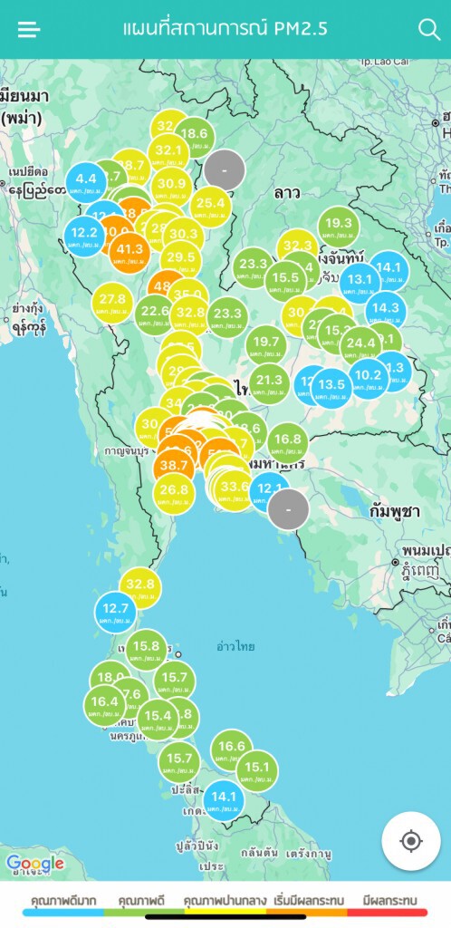 ศูนย์สื่อสารการแก้ไขปัญหามลพิษทางอากาศ (ศกพ.) กรมควบคุมมลพิษ รายงานคุณภาพอากาศประจำวันที่ 4 ธันวาคม 2568 ณ 07:00 น ภาพรวมปริมาณฝุ่นละออง PM2.5 ในประเทศ พบเกินค่ามาตรฐานในหลายพื้นที่ (สีส้ม) โดยเฉพาะอย่างยิ่ง พื้นที่กรุงเทพมหานครและปริมณฑล