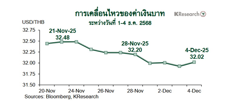 ในวันพฤหัสบดีที่ 4 ธ.ค. 2568 เงินบาทปิดตลาดในประเทศที่ 32.02 บาทต่อดอลลาร์ฯ เทียบกับระดับ 32.20 บาทต่อดอลลาร์ฯ ในวันศุกร์ก่อนหน้า (28 พ.ย.) สำหรับสถานะพอร์ตการลงทุนของนักลงทุนต่างชาติระหว่างวันที่ 1-4 ธ.ค. 2568 นั้น นักลงทุนต่างชาติซื้อสุทธิหุ้นไทย 3,632 ล้านบาท แต่มีสถานะอยู่ในฝั่ง Net Outflows ออกจากตลาดพันธบัตรไทย 1,700 ล้านบาท (ขายสุทธิพันธบัตร 540 ล้านบาท และตราสารหนี้หมดอายุ 1,160 ล้านบาท)