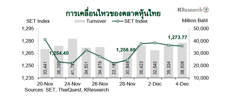 ในวันพฤหัสบดีที่ 4 ธ.ค. 2568 ดัชนี SET ปิดที่ระดับ 1,273.77 จุด เพิ่มขึ้น 1.36% จากระดับปลายสัปดาห์ก่อน ขณะที่มูลค่าการซื้อขายเฉลี่ยต่อวันอยู่ที่ 35,948.79 ล้านบาท เพิ่มขึ้น 8.74% จากสัปดาห์ก่อน ส่วนดัชนี mai เพิ่มขึ้น 0.87% มาปิดที่ระดับ 216.19 จุด