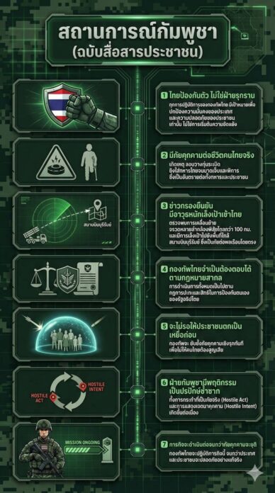 กัมพูชา ระดมยิงถล่มไทย ด้วย BM-21–ปืนใหญ่–โดรนพลีชีพ หลายจุด ทหารไทย ชี้ ตอบโต้ตามสิทธิป้องกันตัว ทภ.2 ทำคู่มือฉบับประชาชน ลำดับเหตุการณ์ที่เกิดขึ้น