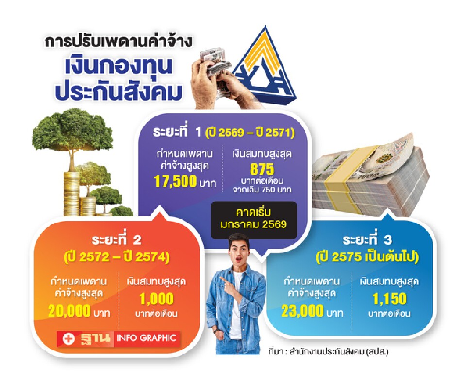 ระยะที่ 1 ระหว่างปี พ.ศ.2569–2571 กำหนดเพดานค่าจ้างสูงสุด 17,500 บาท คิดเป็นเงินสมทบสูงสุด 875 บาทต่อเดือน จากเดิม 750 บาท คาดเริ่มมกราคม 2569