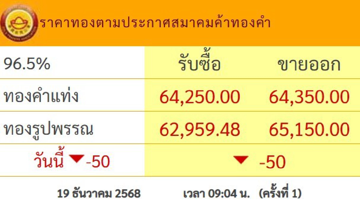 ราคาทองวันนี้ ประจำวันศุกร์ ที่ 19 ธ.ค. 68 สมาคมค้าทองคำ ประกาศ ราคาซื้อ - ขาย (ประกาศครั้งที่ 1) เมื่อเวลา 09.04 น.