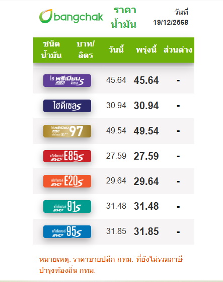 หมายเหตุ : ราคาอ้างอิงจาก บมจ.บางจากฯ ควรตรวจสอบราคา ณ สถานีเติมน้ำมันอีกครั้ง ราคาข้างต้นยังไม่รวมภาษีบำรุงท้องที่ กทม. ราคาพรุ่งนี้จะมีผลตั้งแต่เวลา 05.00 น.