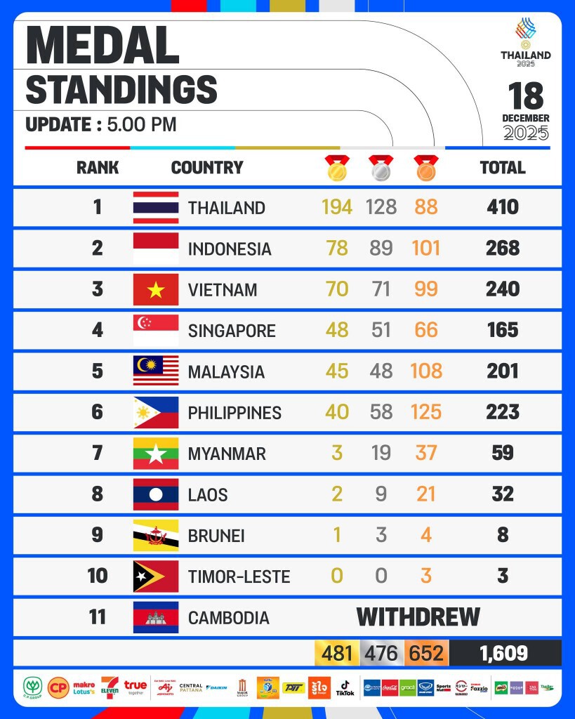 สิงคโปร์ อยู่อันดับ 4 มี 48 เหรียญทอง อันดับ 5 มาเลเซีย 46 เหรียญทอง ฟิลิปปินส์ อันดับ 6 มี 41 เหรียญทอง